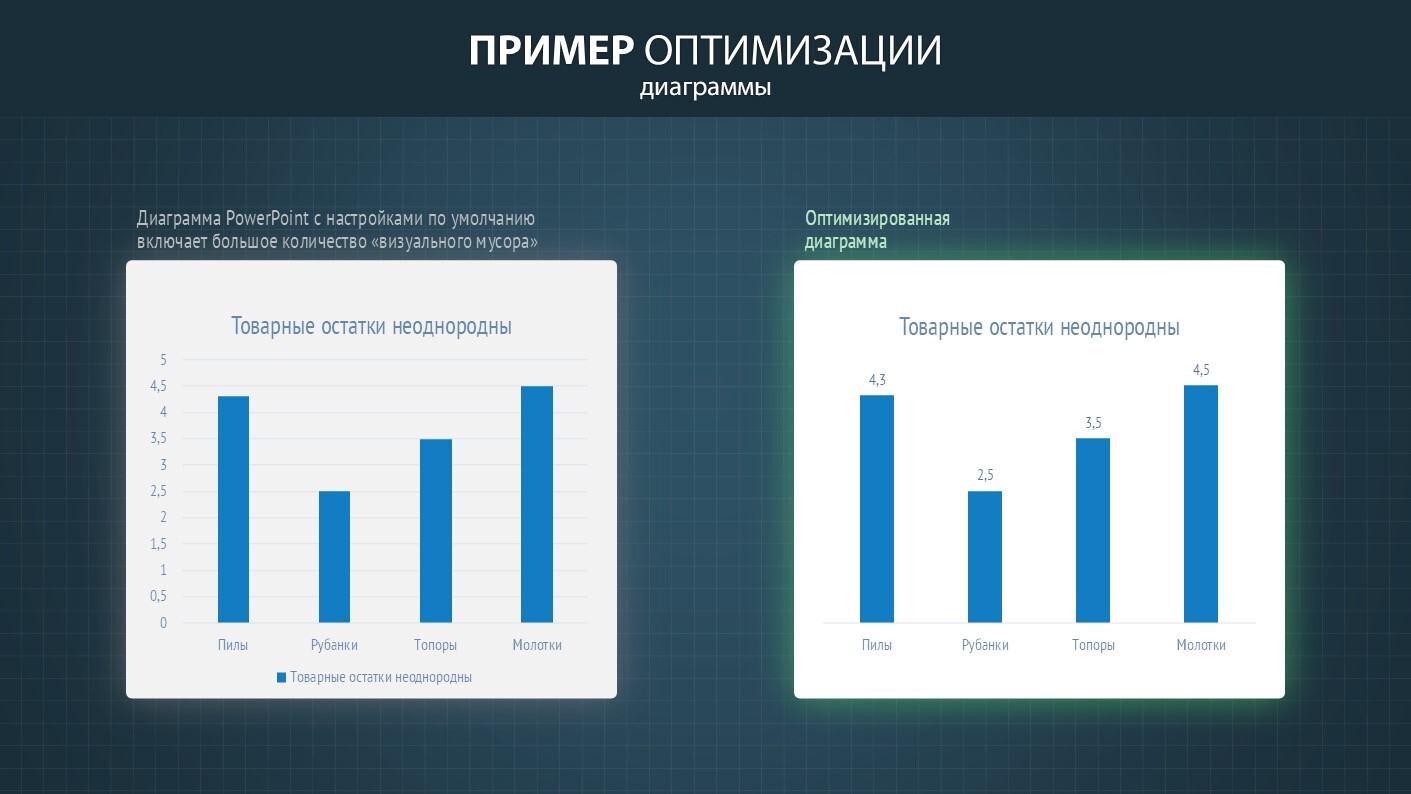 Стандартные шаблоны диаграмм Microsoft Office перегружены избыточными элементами и их прямолинейное использование с настройками «по умолчанию» усложняет восприятие данных и требует от зрителя лишних когнитивных усилий.