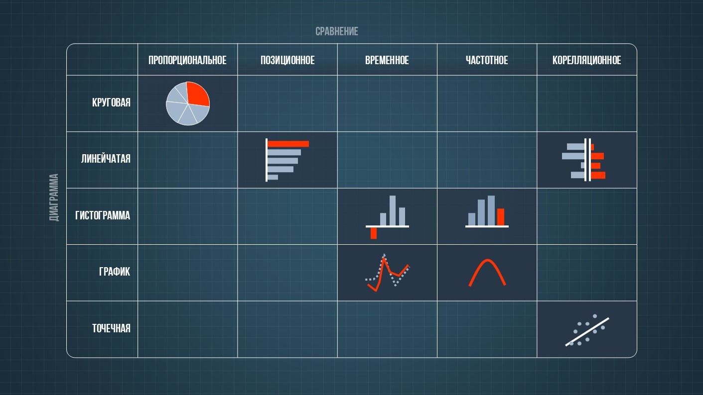 Тип диаграммы подбирается в зависимости от характера сравнения данных: столбчатая для категорий, линейная для трендов и т.д. Некоторые соответствия для выбора визуализации в соответствии с видом сравнения данных приведены в таблице.
