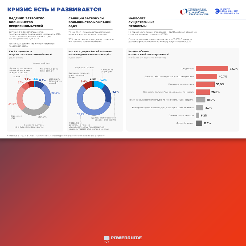 В 2022 году институт Уполномоченного при Президенте России по защите прав предпринимателей Бориса Титова провел с 17 по 21 мая совместно с Институтом экономики роста им. Столыпина провел мониторинг текущего состояния бизнеса в России. Агентству визуальной коммуникации PowerGuide.ru было поручено подготовить презентацию для представления результатов исследования.